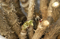 幹にはトゲがあり怖そうな芽ですが、食べると美味しいのです。 |